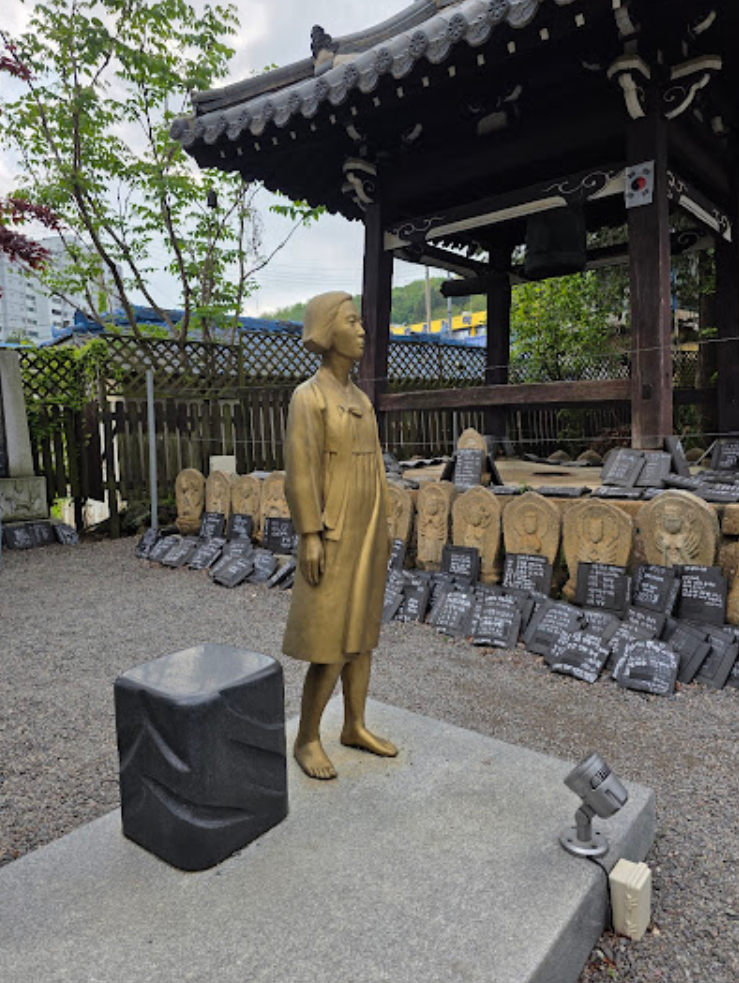 내부에는 금빛 좌불상이 자리한 대웅전, 군산 평화의 청동 소녀상, 일본의 만행을 참회하는 참사문비가 세워져 있어 일제강점기 역사의 아픔을 되새겨볼 수 있는 장소이기도 합니다. 사찰 뒤쪽으로는 기념품 샵과 카페도 자리하고 있어 잠시 쉬어가기에도 좋답니다.