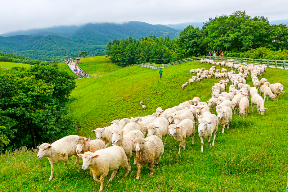 세 번째 양떼목장은 말 그대로 양으로 시작해서 양으로 끝나는 곳이에요. 입구에서부터 양 몇 마리가 보이는데, 꽤 힘든 오르막을 올라가다 보면 넓은 초원 위에 양들이 뛰어놀고 있답니다.